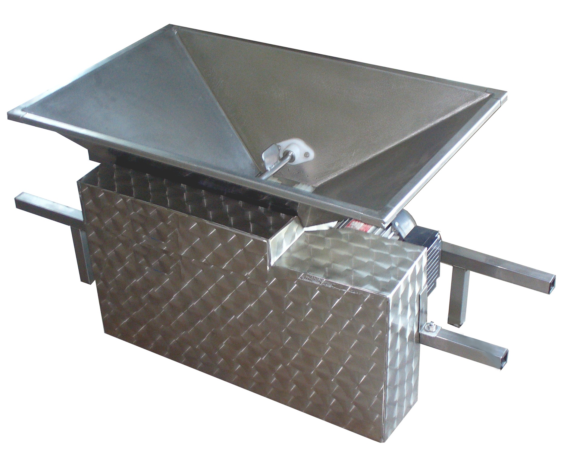 Motorized crusher-with agitator. Available with aluminium rollers (standard), nylon or rubber food. The rollers support allows an adjustment of pressing, and ensures the integrity from the passage of any solid parts. Available in the following versions: in smalted iron; only with stainless steel hopper and agitator; completely in stainless steel. The agitator is available in GRAPE version with paddle, or in fruit version with KNIVES model K or KP.