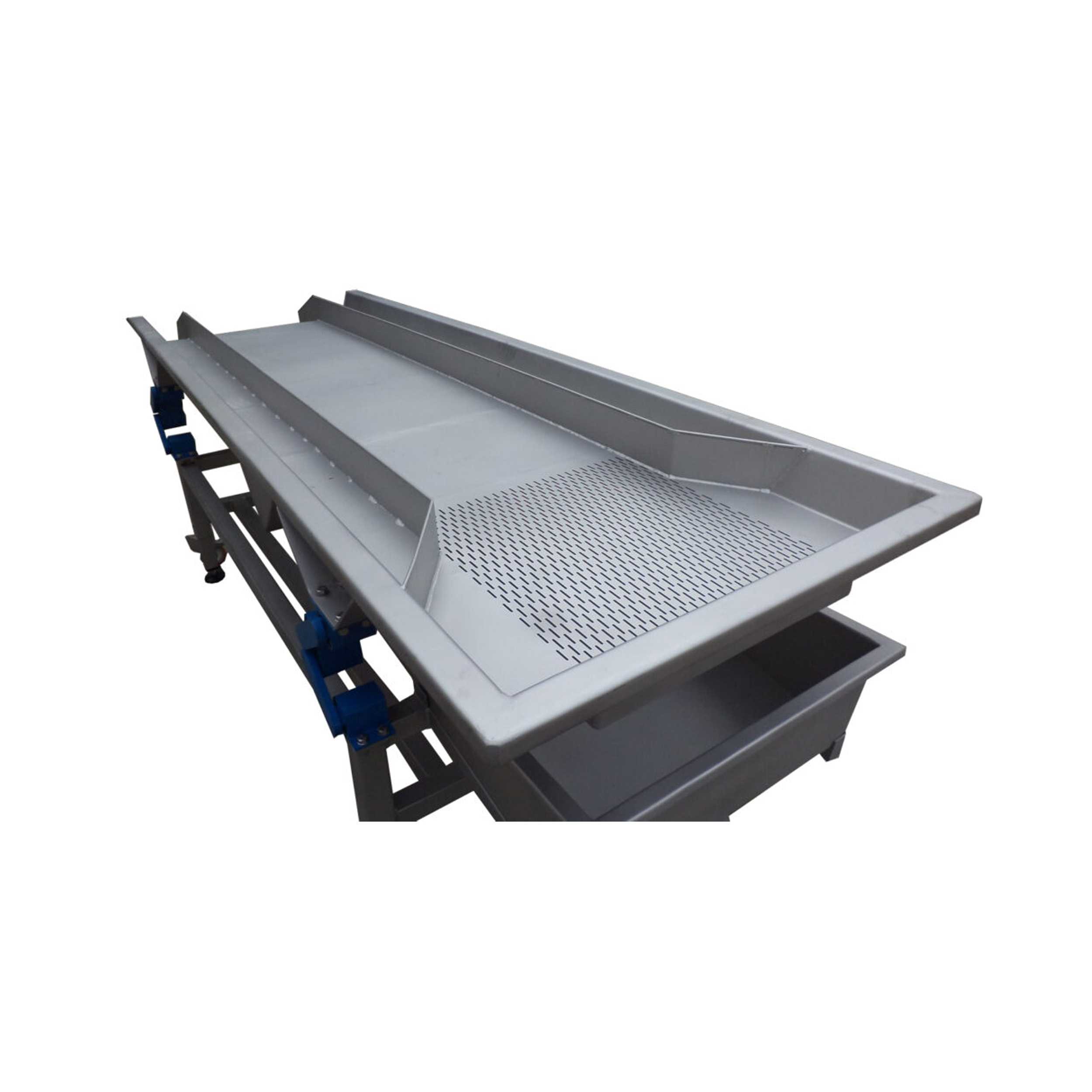 - Tavolo di selezione vibrante, costruito interamente in acciaio inox, dotato di doppi canali laterali di scarto, e griglia forata con vasca di raccolta. Permette una corretta distribuzione dei chicchi diraspati per facilitare le operazioni manuali di cernita e selezione. La struttura è dotata di gambe telescopiche, per consentire una facile installazione di gruppi di pigiatura e/o pompe di raccolta a fine linea.