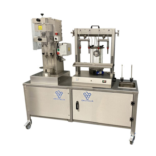 Monoblocco semimanuale di riempimento e tappatura componibile sulle specifiche del cliente. Il sistema è composto di un banco in acciaio inox AISI 304 su ruote con lunghezza 1400 oppure 2000mm; una riempitrice per bottiglie disponibile sia nella versione a gravitazione sia nella versione a depressione; un sistema di tappatura che può essere selezionato tra tappi sughero (sia nella versione pneumatica sia nella versione motorizzata), tappi a vite, tappi corona.